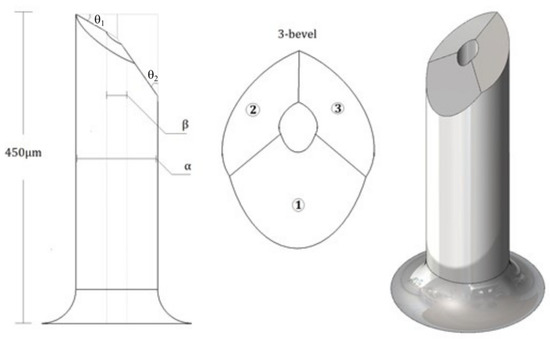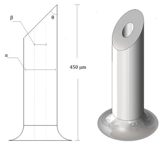 The MN structure of the tip is inspired by a hypodermic needle three bevel tip; i.e., it has three areas where the force exerted by the skin will be distributed during penetration, and it has two shear angles, θ1 = 30° and θ2 = 35°, as shown in Figure 2, a length of 450 μm and a range of inner diameter (β) and outer diameter (α).