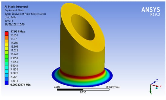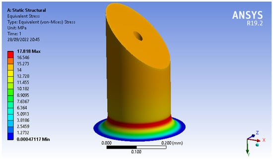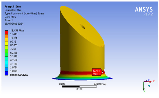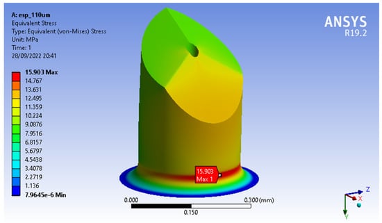 With a minimum diameter of 30 μm, the outer diameter varied in the mechanical simulation until finding the value where the von Misses forces were as close as possible to 18.250 MPa (since this is the permissible value for safety factor 4). Considering that the material’s tensile strength is 73 MPa, the minimum outer diameter was around 208 μm, the maximum von Misses stress was 17.818 MPa (see Figure 5) and the maximum outer diameter was 250 μm; the same procedure was performed. However, the inner diameter varied until finding the maximum value (where the MN did not exceed the tensile strength of the resin, which is 134 μm), the maximum inner diameter and a von Misses stress of 17.931 MPa (see Figure 6). Table 1 shows the values obtained for the inner and outer diameter.