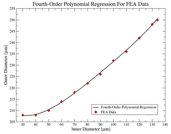 Graph of the fourth-degree polynomial relationship: The x-axis is the inner diameter (µm), and the y-axis is the outer diameter (μm).