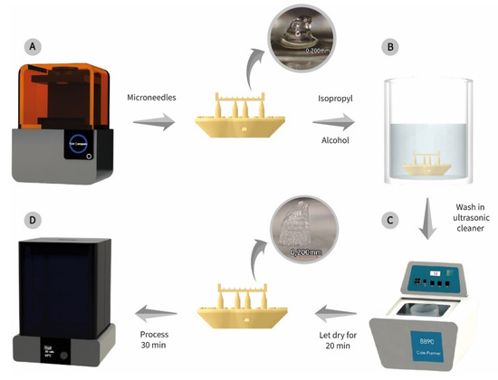 Microneedle 3D-printing process. (A) Microneedle fabrication in the Form 2 printer, (B) the immersed piece in isopropyl alcohol, (C) ultrasonic cleaner to eliminate the excess resin generated and (D) cured piece in the FormCure at 60 °C.