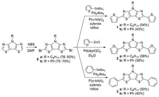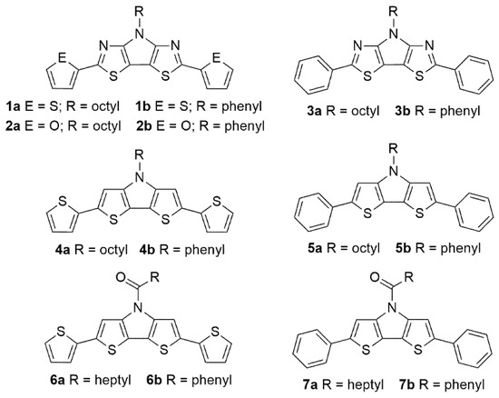 More recently, further synthetic modification of these tricyclic fused bithiophenes has included the preparation of analogues in which the flanking thiophene rings have been replaced with thiazole. Much of these efforts have been driven by a desire to stabilize the high HOMO energies typical of the species illustrated in Figure 1. This is particularly true for the highly electron-rich DTP units, where these high energy levels can limit stability and the effective application of DTP-based materials to various devices. As such, it is not surprising that the first example of these thiazole species was the DTP analogue pyrrolo[2,3-d:5,4-d′]bisthiazole (PBTz, Figure 2) [15,16,17]. Introduced by Heeney and co-workers in 2010 [15], these new PBTz units have then been applied to both small molecules [16,18] and polymeric materials [15,19,20,21,22].