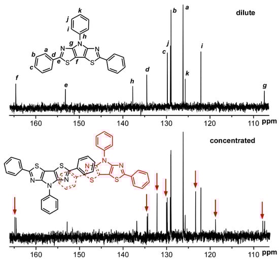 While the N-octyl functionalized oligomers all exhibited good solubility in organic solvents, the analogous N-phenyl derivatives exhibited diminished solubility. The species end-capped with either thienyl or furyl groups (1b and 2b) were still soluble enough that sufficient quantities could be dissolved in CDCl3 for 13C NMR measurements at 40 ℃ without complications. The final oligomer 3b, containing phenyl moieties at all three variable positions, however, was found to be the least soluble such that measurements at normal concentrations would not fully dissolve, even when performing measurements at the maximum scanning temperature of 50 ℃. Under such conditions, additional 13C resonances were found in comparison to the other analogues, which seemed to indicate potential aggregation. As shown in Figure 5, the resonances corresponding to the PBTz core and the phenyl end-caps each had a duplicate, slightly shifted in comparison to the expected values. This was ultimately explained via a proposed slipped-stack interaction between two oligomers, which would thus provide a different chemical environment for seven carbons in each molecule. Such a packing interaction had also been observed in the X-ray structure of a previous thienyl-capped DTP oligomer [24]. Repeating the measurement at low concentration (7 mg in 700 μL CDCl3) resulted in the loss of these additional resonances to give the expected number of carbon signals, further supporting the hypothesis of aggregated dimers at higher concentrations.