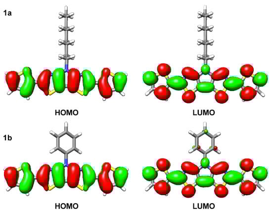 For all the PBTz oligomers, the lowest energy electronic excitation is largely attributed to a one-electron excitation from the HOMO to the LUMO. As previously seen for diaryl-capped DTP oligomers [24,25], both the HOMO and LUMO of the PBTz analogues are of π nature and spread over the entire conjugated backbone with no real contribution from the N-alkyl or N-phenyl groups (Figure 9). The observed blue-shift in absorption for the phenyl-capped oligomers is well reproduced by the theoretical calculations (i.e., the excitation energy is calculated to increase by 0.10 eV from 1a and 3a). In addition, theoretical calculations predict a small blue-shift upon replacing N-alkyl with N-aryl groups (i.e., 2.97 eV in 1a and 2.98 eV 1b), which agrees well with the experimental data and is consistent with trends previously found for the DTP analogues [25]. However, it should be pointed out that the theoretical calculations significantly overestimate the oscillator strengths in all cases.