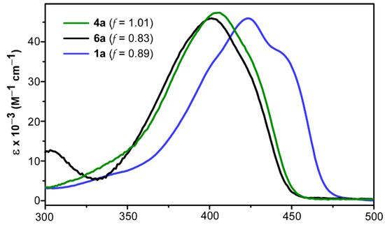 Across the complete series of PBTz oligomers, the N-phenyl derivatives (i.e., 1b, 2b, 3b) exhibit a small blue-shift in absorbance in comparison to the corresponding N-octyl species (i.e., 1a, 2a, 3a), with a corresponding decrease in absorptivity as determined by both the extinction coefficients and oscillator strengths. In this respect, the PBTz oligomers are in excellent agreement with the previous DTP analogues, which also exhibited the same trends with N-functionality [25]. Additional trends can also be seen based on the choice of end-capping species, with increasing absorbance red-shifts observed in the order phenyl < furyl < thienyl, with the two energetic extremes shown in Figure 8. The differences observed between the thienyl-capped and phenyl-capped species are consistent with both the previous DTP analogues and diaryl-capped 2,2′-bithiophenes [25]. The observed blue-shift for the phenyl-capped species has been attributed to various factors, with the most basic being increased steric interactions between the phenyl groups and the bithienyl core. This is somewhat supported by DFT calculations which revealed increased torsional angles between the external phenyl rings and the central DTP, with the angles of the phenyl-capped species ca. 7° greater than for the thienyl-capped analogues (see SI, Figures S18–S20). This deviation could be due to the spatial proximity of the DTP C-H at the 3- and 5-positions with the ortho-C-H of the phenyl groups, akin to a 1,6-diaxial interaction between the two hydrogens. However, as the C-H units of the DTP have been replaced by nitrogen in the PBTz, such an interaction would be absent in the PBTz species, yet the phenyl-capped PBTz oligomers exhibit shifts of the same magnitude as the DTP analogues. Another factor thought to play a role is the increased electron confinement in the more aromatic benzene in comparison to that of thiophene [38,39], which would reduce electronic delocalization across the molecular backbone. Unlike the steric argument, this factor would be consistent between both the DTP and PBTz oligomers and thus provides a more likely explanation.