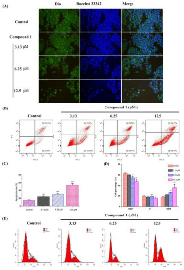 Effects of compound 1 on cell morphology, cell apoptosis, and cell cycle of HepG2 Cells in vitro. HepG2 cells were seeded in 12–well plates. After 24 h incubation, cells were incubated with compound 1 for another 48 h. Cell morphology assay (A): The cells were washed with PBS, fixed by paraformaldehyde, washed with PBS, stained with Dio, washed with PBS, stained with Hoechst 33342, and washed with PBS. The cells were then observed and photographed using a fluorescence microscope. Cell apoptosis (B,C) and cycle (D,E) assay: In the cell apoptosis assay, all the cells were collected, and 100,000 cells were taken and incubated with Annexin V–FITC and PI for 20 min at room temperature without light. In the cell cycle assay, all the cells were collected and fixed with precooled 70% ethanol for 12 h at 4 °C. The cells were then washed with PBS and incubated with PI for 30 min at 37 °C without light. Finally, all the cells were detected using a flow cytometer. Data are presented as mean ± SD, n = 3. One way ANOVA, ** p < 0.001, *** p < 0.001, compared with control group.