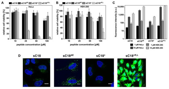 Our next investigations focused on the improvement of sC18*. Based on this peptide we created sC18*R,L by exchanging several aa residues with arginine and leucine to receive a nearly perfect amphipathic structure (see Figure S1). Our aim was to enhance the overall uptake efficacy, which was usually relatively low for sC18* itself. Within the next studies, we tested both peptides in comparison to sC18 and sC18ΔE. First, we elucidated their cytotoxicity towards HeLa and HEK293 cells. For the peptides sC18, sC18* and sC18ΔE we observed no toxic effect up to 50 µM in HeLa cells, similar to previously obtained results [10,12,25]. Further increasing the concentration of those peptides up to 100 µM resulted in decreased cell viability of up to 75%. On the other side, peptide sC18*R,L had higher activity in HeLa cells compared to the other peptides tested and decreased cell viability at 25 µM to nearly 35%. In HEK293 cells, the toxic effect of sC18*R,L was not that dramatic and started when cells were incubated with 50 µM peptide concentration. The reason for the stronger interaction with HeLa cells might be due to the high content of basic amino acids within the structure of sC18*R,L leading to a strong electrostatically driven approaching of the peptides towards the more negatively charged plasma membrane of HeLa compared to HEK293 cells. This membrane accumulation might then have led to membrane disturbing effects.