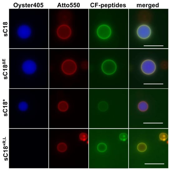 Peptide interaction with giant lamellar vesicles (GUVs) composed of DOPC/DOPE/DOPG (40:30:30); 1 µM solutions of sC18 variants were incubated with GUVs for 30 min and inspected using a fluorescence microscope (Keyence). Red: Atto550; green: CF-labeled peptides, blue: Oyster 405. Scale bar: 50 µm.