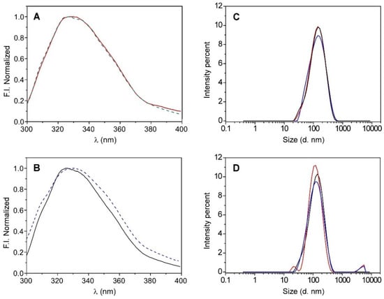 Emission spectra of KcsA (panel (A)) after reconstitution it in liposomes, KcsA@lipo, that are composed of asolectin (red line) or DOPE:DPPG (7:3) (green dashed line), and (panel (B)) it being in solution in a monomeric (blue dashed line) and a tetrameric (black line) state. DLS size distributions by intensity recorded in triplicate for KcsA@lipo (panel (C)) and KcsA@Aso (panel (D)) nanoparticles.