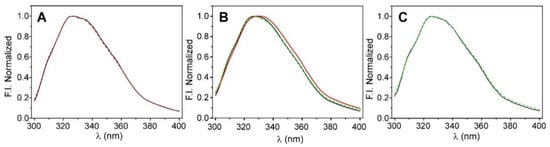 The results show that there are no significant differences in the emission spectrum of the protein regardless of the lipid composition that was used in the reconstitution (Figure 1A). Moreover, if these spectra are compared to those from the native KcsA tetramer, they are very similar, but different from the denatured KcsA monomer, which shows a pronounced red shift and broadening in the emission spectrum (Figure 1A,B). These spectral differences between the monomeric and tetrameric KcsA conformations have been previously reported, and they are used to monitor the dissociation of the protein [26,27]. This result suggests that both of the lipid systems (KcsA@Aso and KcsA@PE:PG nanoparticles) allow the channel to adopt its native tetrameric conformation.