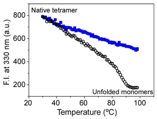 Afterwards, we proceeded to test if the conformational plasticity of the SF was maintained. To do so, a monolith containing the KcsA@PE:PG nanostructures in 20 mM Hepes, 100 mM KCl, and pH 7.0 buffer were extensively washed with a buffer to replace the permeant cation K+ with Na+, the physiological relevant blocker. Under this experimental condition, the SF conformation shifted from a conductive conformation to a collapsed-nonconducting form. This shift in the equilibrium is characterized by a small movement of the fluorescence emission spectrum to higher wavelengths [23], which was in fact detected in the immobilized particles (Figure 2B). Moreover, this process was fully reversible since the samples in the Na+ returned to the K+ behavior after washing again the monolith in K+ buffer. The behavior, starting with the monoliths in sodium as the initial condition, was analogous: the starting spectrum red-shifted due to the presence of Na+, then blue-shifted by adding K+, and returning to the initial spectrum when reverting to Na+ (data not shown). These results suggest that the conformational equilibrium of the SF is preserved after the immobilization of the KcsA@PE:PG nanostructures into the sol-gel matrices, even though the spectral shift is small. To confirm these observations, we decided to also test the thermal stability of KcsA.