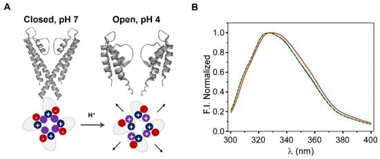 Panel (A): Scheme of the opening of the KcsA channel and the pH sensor, showing the charge of the aminoacids that were involved in channel opening at the activation gate. Panel (B): Changes in the fluorescence emission spectra of the KcsA@PE:PG nanostructures that were immobilized in the sol-gel matrices, which were associated with this gating process; pH conditions: pH 7 (black line), pH 4 (red line), and reversion to pH 7 (dashed green line).