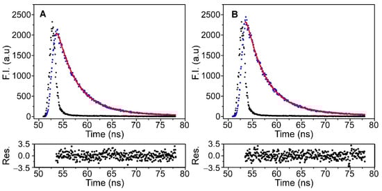 Time-resolved fluorescence decays of KcsA in the KcsA@PE:PG nanostructures in solution (panel (A)) and after their immobilization in silica matrices (panel (B)), which were collected at 25 °C (black dots). The instrumental function (blue dots), the fit to a biexponential equation (red line) and the residuals obtained for the fit are also shown.