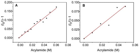 In combination to the time-resolved characterization experiments, steady-state fluorescence quenching experiments were carried out to obtain additional information on the effect of immobilization on the KcsA properties. The quencher selected for this purpose was acrylamide, which is water soluble and practically does not penetrate the lipid bilayer. Therefore, this experiment provides information on the degree of water exposition of the channel Trp residues, and whether there is any difference between the free and immobilized systems. The addition of this quencher to the different samples produced a decrease in fluorescence intensity, although the effect was less pronounced in the case of the immobilized system. The obtained results are shown in Figure 6 and are represented as Stern–Volmer plots. The plots are linear over the range of the acrylamide concentrations that were studied, and they were satisfactorily fitted to the Stern–Volmer equation (Equation (3)).