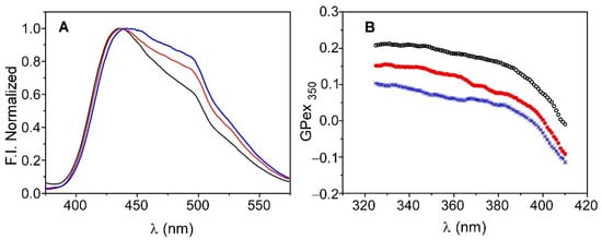 Fluorescence spectra measurements of KcsA and Laurdan were carried out using a SLM-8000C fluorimeter (SLM Instrument Inc., Urbana, IL, USA). Emission spectra were performed at 25 °C by using an excitation wavelength of 280 nm for the KcsA@PE:PG nanoparticles and 350 nm for Laurdan-containing samples. Changes in the Laurdan emission spectra were quantified from the calculation of the generalized polarization GPex) over a range of excitation wavelengths between 325 and 410 nm and collecting the emission at 440 and 490 nm [31,32].