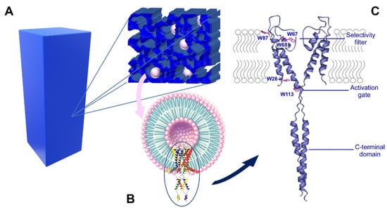 Nanostructured silica matrices with KcsA proteoliposomes. Panel (A) is a representation of the silica matrix that was obtained after gelation, containing KcsA@Lipo within its pores. Panel (B) shows the Kcsa@Lipo particles that are formed by KcsA tetramer that is reconstituted in liposomes, adopting an inside-out configuration (C-terminal domain exposed to the extravesicular space). Panel (C) shows the ribbon structure of KcsA, showing the five Trp residues that are mainly responsible of the intrinsic protein fluorescence, the C-terminal domain, the selectivity filter and the activation gate. Only two subunits are represented for clarity (PDB: 3EFF).