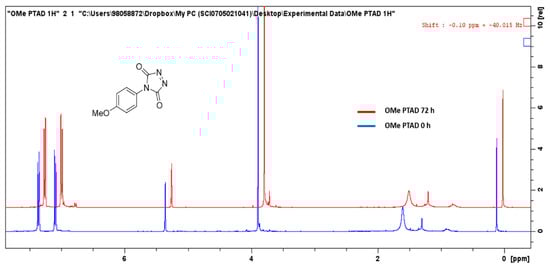 1H-NMR of 4-[4-(methoxy)phenyl]-1,2,4-triazole-3,5-dione (5f) stock solution immediately after preparation (red) and after 72 h in CDCl3 (blue).