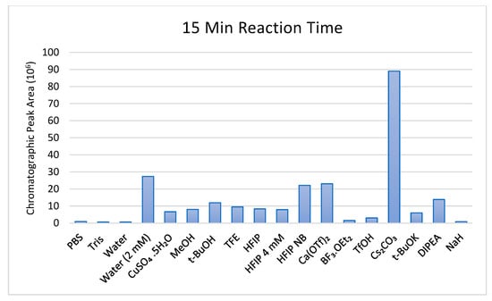 Test reactions were initially performed in aqueous systems for reference; as anticipated, phosphate and Tris-buffered systems and deionized water performed poorly relative to the acetonitrile-based solvent systems. Interestingly, the test reaction containing 2 mM of water in acetonitrile outperformed almost all other test reactions, indicating that water acts at a catalytic capacity at this concentration rather than as a competing nucleophile (Figure 2).