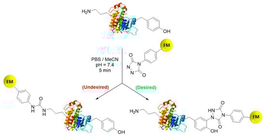 PTAD derivatives offer excellent chemoselectivity for tyrosine residues; this is evident from the investigations performed by Ban et al., who introduced PTAD to an equimolar solution of C- and N-protected amino acids, bearing potentially reactive side chains, including Cys, Lys, Ser, His, Trp, Arg and Tyr [2]. The authors found that only trace amounts of lysine (Lys) and tryptophan (Trp) were modified, obtaining the desired tyrosine conjugate in 55–58% yields.