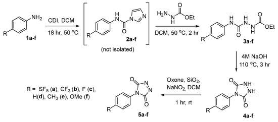General procedure for the synthesis of (5a–f): A suspension of 4-[4-(pentafluoro-λ⁶-sulfanyl)phenyl]-1,2,4-triazolidine-3,5-dione (0.606 g, 2 mmol), [KHSO4-2KHSO5-K2SO4 (1.842 g, 3 mmol)], wet SiO2 (50% w/w) (0.8 g), and NaNO2 (0.621 g, 9 mmol) in dichloromethane (12 mL) was stirred at room temperature for 1.5 h and then filtered. Anhydrous Na2SO4 was added to the filtrate. After 10 min, the resulting mixture was filtered. Dichloromethane was removed by rotary evaporation to obtain the solid product. Experimental data can be found in the Supplementary Materials.