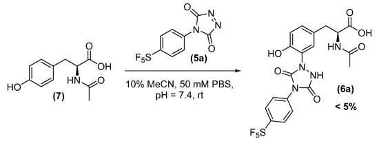 Following these results, conjugations were not attempted in completely aqueous conditions; instead, a semi-aqueous system was utilised to improve the solubility and subsequent availability of the tyrosine precursor for reaction whilst effectively minimising the concentration of water (Scheme 3). Furthermore, three equivalents of PTAD solution were used and added dropwise rather than all at once, as recommended by Ban et al. [1]. Despite these modifications, no improvement in yield was observed (<5%), suggesting that the electron-withdrawing effect of the –SF5 substituent of 5a was the primary limiting factor influencing the success of the bio-conjugation reaction.