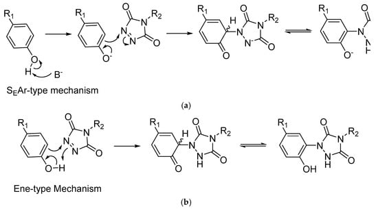 Differing SEAr-type (a) and Ene-type (b) mechanisms for the conjugation of PTAD derivatives with tyrosine.