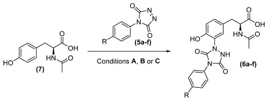 Conjugation of PTAD derivatives (5a–f) with N-acetyl tyrosine (7). Reaction conditions: (A) MeCN, Cs2CO3 (2 equiv.); (B) MeCN, HFIP (2 equiv.); (C) DCM, HFIP (2 equiv.)