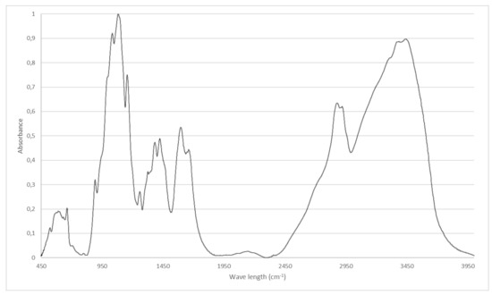 The chito-oligosaccharide BioA187 was enzymatically extracted and purified from chitosan of fungal cell wall. Fungal chitosan (KitoZyme, Herstal, Belgium) was washed with cold water to remove salts, then dissolved under stirring in 0.1 M acetic acid at room temperature and adjusted to pH 5.5 using NaOH. This was followed by hydrolysis under stirring for 20 h at 30 °C using cellulase from Trichoderma viride (VWR, Leuven, Belgium). Purification of the resulting mixture was carried out using tangential flow filtration Vivaflow 200–10,000 MWCO-PES (Sartorius, Goettingen, Germany) followed by a precipitation with 90% ethanol for 48 h, centrifugation and evaporation using rotavap to eliminate remaining ethanol. The pellet was then lyophilized and the BioA187 chito-oligosaccharide was weighted and characterized by Fourier Transform InfraRed (FTIR) and thermogravimetric analysis (TGA). In detail, the thermogravimetric analysis was performed using a TGA 2 (Mettler Toledo) coupled with the STARe Excellence software. A quantity of 3–5 mg of each sample was placed in an open crucible and the temperature was raised from 40 °C to 600 °C at a heating rate of 10 °C per minute. The Fourier Transform InfraRed (FTIR) analyses were performed with a Spectrum One spectrophotometer (Perkin Elmer) operating in transmission mode. FTIR analysis was carried out using the sample dispersed in KBr (1:20 weight ratio). The wavenumber range was 4000–400 cm−1 and the resolution was 4 cm−1, with 12 scans performed on each sample. The system was coupled with the Spectra software for further analysis, such as obtaining the area of the characteristic peaks (i.e., 1655 cm−1 and 1600 cm−1 corresponding respectively to amide I and NH2/amide II bands). The deacetylation degree (DD) was determined according to the method reported by Domszy and Roberts [94] using the FTIR results, where A1655 and A3450 are the absorbance at 1655 cm−1 of the amide-I band for the measurement of the N-acetyl group content and 3450 cm−1 of the hydroxyl band as an internal standard. The factor ‘1.33’ denoted the value of the ratio of A1655/A3450 for fully N-acetylated chitosan (Scheme 2).