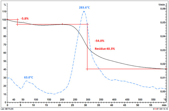 The chemical structure of BioA187 was confirmed by FTIR, and a strong broad absorption peak at 3350 cm−1 was an overlap of N–H and O–H stretching vibration absorption peaks, which were sensitive to intermolecular hydrogen bonds (Figure 1). Peak at 2884 cm−1 was the absorption of C–H stretching vibration of methyl or methine. The FTIR spectrum of COS displayed peaks at 1634, 1529, and 1378 cm−1, corresponding to characteristic absorption peaks of amide I, amide II, and amide III bands. Furthermore, the absorption peak at 1073 cm−1 was the stretching vibration of C–O in the C-6 position. As observed on thermogram in Figure 2 of TGA analysis, in the interval between 30 °C and 100 °C (63 °C), a weight loss is attributed to water evaporation. Then the weight of partially deacetylated chitosans remained stable up to 250 °C followed by a very strong loss of weight up to a maximum loss at 334 °C. The TGA thermogram showed a 54% weight loss corresponding to the pyrolytic decomposition of the molecule at 283.6°C, the maximum degradation temperature of BioA187 (red line in Figure 2). According to Corazzari et al. [56], this corresponds to a main process involving the release of H2O, NH3, CO, CO2 and CH3COOH in the temperature range 250–450 °C, causing a weight loss of 54% and corresponding to the pyrolytic degradation of the chitosan characteristic of the chitosan structure [57,58]. The DD of COS BioA187 was evaluated at 63.3%, which represents a relatively high DD.