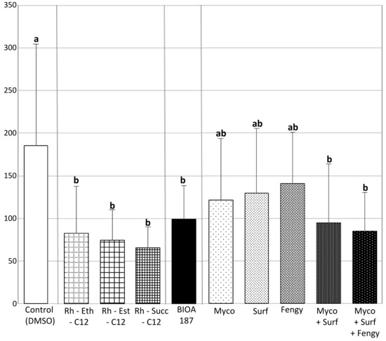 Three smRLs (Rh-Eth-C12, Rh-Est-C12, Rh-Succ-C12), the COS BioA187 as well as bacterial CLPs treatments (M, S, F and two mixtures M + S, M + S + F) were tested in controlled conditions for their protection efficacy against Bgt on one susceptible cultivar of wheat (Pakito). Disease symptoms were observed on control plants (0.1% DMSO-treated) and evaluated with an average of 185 colonies on the third leaf (Figure 4). Spraying of the three smRLs, Rh-Eth-C12, Rh-Est-C12 and Rh-Succ-C12, at 100 µM conferred a significant protection to wheat against Bgt by about 55, 60 and 65%, respectively, compared to the control. BioA187 also led to a significant wheat protection against Bgt by about 47%. Concerning the tested CLPs, only the treatments combining mycosubtilin and surfactin (M + S) and mycosubtilin, surfactin and fengycin (M + S + F) significantly protected the plants, by 49 and 54%, respectively (Figure 4).