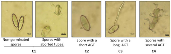 Following a first screening, all molecules were tested at concentrations ranging from 50 to 300 µM. Petri dishes were filled with agar at 12 g·L−1, prepared in deionized water, and supplemented with a range of increasing concentrations (50, 100, 200, 300 µM) of each molecule or mixture diluted in 0.1% DMSO. The control being an agar medium containing only 0.1% DMSO. Fresh spores of Bgt have been dispersed on the dishes and then observed after 48 h of incubation at 20 °C. The germination was randomly determined on 200 conidia per plate using a light microscope (Olympus BX 40). The conidia were classified in 4 categories: non-germinated spores and spores with aborted tubes (C1), spores with a short appressorial germ tube (AGT, C2), spores with a long AGT (C3), and spores with several AGT (C4) (Figure 6). The spore distribution in the four described categories were reported in frequency of each.