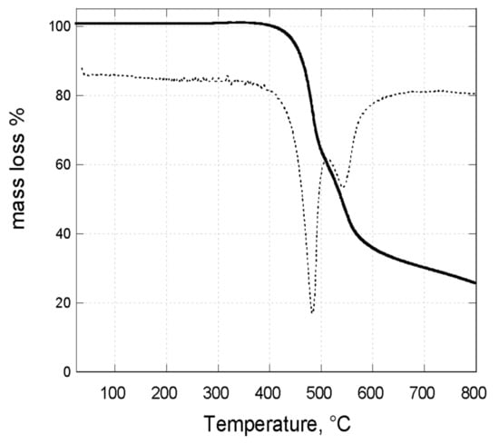 Thermogravimetric analysis (TGA) was carried out at atmospheric pressure using a Perkin Elmer instrument TGA7 (Perkin Elmer, Waltham, Massachusetts, US) The measurements were performed under Ar flow (60 mL/min). Samples of 10 mg were placed in platinum crucibles and scanned in the temperature range of 30–800 °C with a heating rate of 10 °C/min. TGA7 instrument was calibrated with Curie points of Alumel, Nickel, Perkalloy, and Iron standard samples, and the temperature was obtained with an accuracy of ±1 °C.