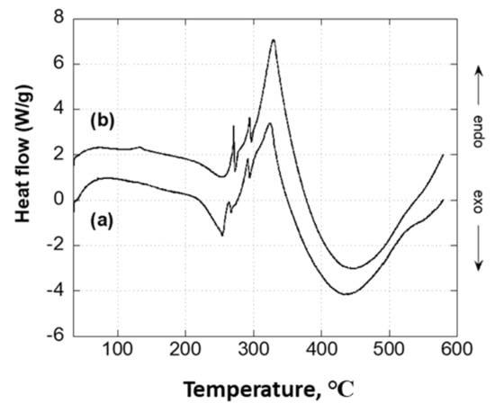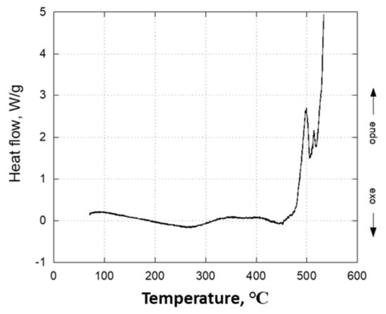 Differential scanning calorimetry (DSC) measurements were carried out at atmospheric pressure using a Perkin Elmer instrument model DSC7 (Perkin Elmer, Waltham, Massachusetts, US). The measurements were performed under Ar flow (60 mL/min). Samples of 5 mg were placed in aluminum crucibles and scanned in the temperature range of 30–550 °C with a heating rate of 10 °C/min. DSC7 instrument was calibrated by measuring the melting temperature of metallic indium and zinc (99.999 mass % purity) and the temperature was obtained with an accuracy of ±0.1 °C.