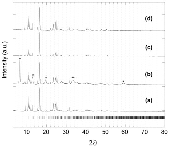 XRPD pattern of [Zn(4,4′-bipy)2(OAc)2]∞ samples prepared by the sonochemical process: (a) sample A (with EtOH-100); (b) sample B (with EtOH-96); (c) sample C (like sample B but methanol (MeOH) washed; (d) sample D (prepared in aqueous solution and washed in methanol). The lower vertical bars represent the reflection position of the [Zn(4,4′-bipy)2(OAc)2]∞ solvothermal sample reported in the literature [51].