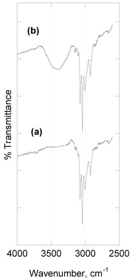 The above FTIR results are confirmed also for C and D samples. A magnification of sample B spectrum in the range 4000–2500 (Figure 7b) exhibits a large band at 3400 cm−1 indicating the presence of water. This band is not observed in sample A in Figure 7a, indicating that the second phase present in the sample B contains water in the structure.