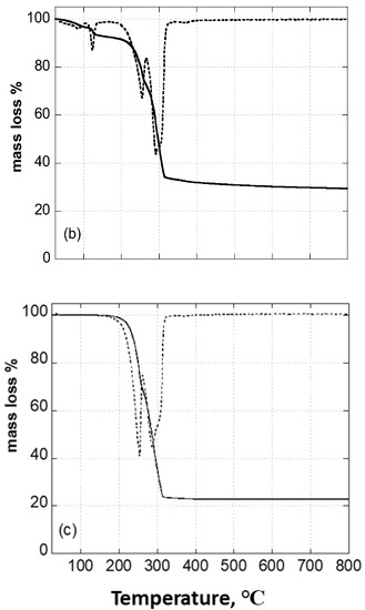 In sample A and C, no step in the 25–165 °C temperature range was observed. The remaining mass after 800 °C is around 23 wt%, in agreement with a 23.9 wt% theoretical value of complete decomposition of [Zn(4,4′-bipy)2(OAc)2]∞ to ZnO [54]. The thermal properties of these two samples are almost indistinguishable (Figure 8a,c).
