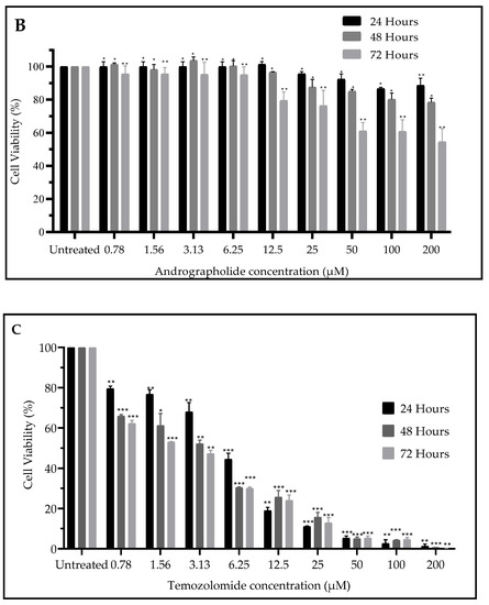 2.1. Andrographolide Suppressed Cell Viability of DBTRG-05MG and SVGp12 Cell Line