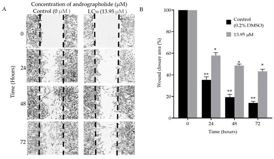 - Yang, S.L.; Kuo, F.H.; Chen, P.N.; Hsieh, Y.H.; Yu, N.Y.; Yang, W.E.; Hsieh, M.J.; Yang, S.F. Andrographolide Suppresses the Migratory Ability of Human Glioblastoma Multiforme Cells by Targeting ERK1/2-Mediated Matrix Metalloproteinase-2 Expression. Oncotarget 2017, 8, 105860–105872. [Google Scholar] [CrossRef] [PubMed]