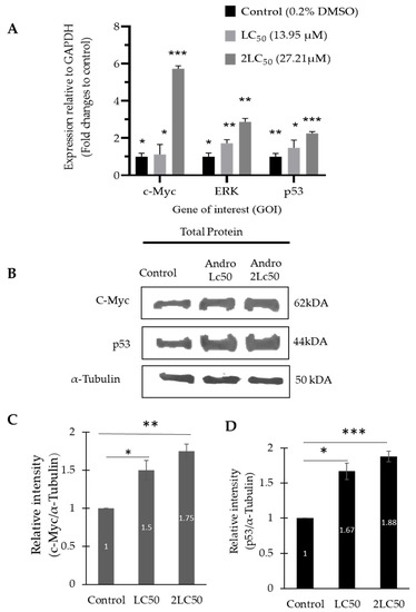 2.5. The mRNA and Protein Expression Level of ERK1/2, p53, and c-Myc Was Increased in DBTRG-05MG Treated with Andrographolide