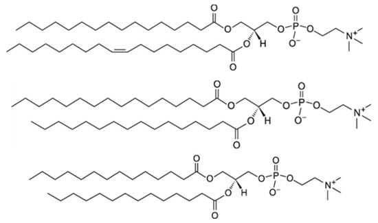 Liposomes were formed from 1-palmitoyl-2-oleoyl-glycero-3-phosphocholine (POPC, Avanti Polar Lipids (Alabaster, AL, USA), purity > 99%), 1,2-dipalmitoyl-sn-glycero-3-phosphocholine (DPPC, Avanti Polar Lipids, purity > 99%), and 1,2-dimyristoyl-sn-glycero-3-phosphocholine (DMPC, Avanti Polar Lipids, purity > 99%) (Figure 1).