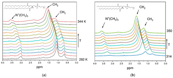 Experiments were carried out for phospholipids with different phase-transition temperatures to observe differences in the responses of the Ho–phospholipid complexes in the systems with the different temperature dependences of the viscosity. Figure 2 shows fragments of 1H NMR spectra of POPC and DPPC liposomes at different temperatures. According to studies of bicelles, lanthanide ions bind with lipid phosphate groups [42]. Separation in the signal of the N+(CH3)3 groups is observed.