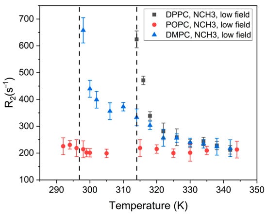 Linear dependencies of R2 on 1/T3 below the phase-transition temperature means that is constant. It could be caused by small changes in viscosity, which are beyond the sensitivity of the holmium complex, same as in the case of POPC. However, near the phase-transition temperature, dramatic changes in transverse relaxation rate occur. It could be connected, with dramatic changes in the bilayer viscosity due to phase transition.