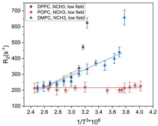 Figure 3 shows the dependence of the low-field components’ relaxation rate (R2) in the signal of the POPC, DMPC and DPPC N+(CH3)3 groups on the temperature. According to the literature, a lanthanide-induced contribution to the relaxation rate enhancement is the sum of dipole–dipole, Fermi–contact, and Curie–spin components [17,35]. Additionally, the Curie–spin contribution depends on the viscosity of the media and the temperature: , where C is the constant, T is the temperature, and is the dependence of the viscosity on the temperature [6]. To estimate the dependence of the viscosity on the temperature for different systems, we plotted the dependence of the low-field components’ relaxation rate (R2) in the signal of the POPC, DMPC, and DPPC N+(CH3)3 groups on 1/T3 (Figure 4). It can be seen from Figure 3 that POPC does not have the temperature dependence of R2 or—correspondingly—the viscosity. A linear dependence of R2 on 1/T3 means that is constant. The main phase-transition temperature of POPC is 270 K, and an observed effect could be caused by small changes in viscosity, which are beyond the sensitivity of the holmium complex in a temperature range of 292–344 K.