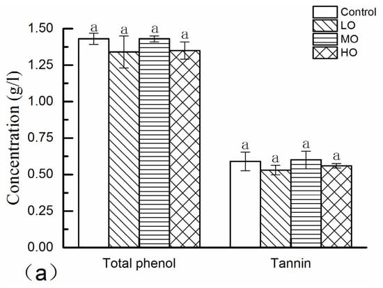 Wine pigments consist of monomeric pigments (MP), small polymeric pigments (SPP) and large polymeric pigments (LPP). MP is a group of compounds bleachable with sulfur dioxide, while SPP and LPP are resistant to bisulfite bleaching. However, LPP can precipitate with ovalbumin, but SPP cannot [29]. As shown in Figure 3c, both SPP and LPP were higher in the wines with higher oxygen exposure, which was in agreement with previous research, which reported that these two polymeric pigments would increase during wine aging [30] and would balance the loss of native anthocyanins and contribute to the stability of color intensity in wines. Furthermore, a greater increase in the amplitude of LPP was examined compared to SPP, which was also usually observed during wine aging [30]. Actually, the values of SPP and LPP after alcoholic fermentation were very little and they began to increase from alcoholic fermentation to bottle aging. Normally the increase in SPP was steeper than LPP at an earlier stage [29] due to the first formation of dimers, and then a trimer formed and so forth until they form polymers, and more LPP would be formed after that phase [35]. As the major pigment after alcoholic fermentation, MP also increased in the presence of oxygen, and wine with higher oxygen exposure contained a higher MP, which was consistent with previous observations [11]. Under the circumstances, the increase in MP might be due to the SO2 catalytic cycle and the increase in SPP and LPP was probably concerned with proanthocyanidins at a lower polymerization degree. After a long time of aging (12 months), MP was found to decrease observably [35]. Although both MP and SPP in all oxygenation wines were significantly higher than in the control wine, these two pigments and LPP were dramatically lower in the LO and MO wines compared with the HO wine, indicating that the oxygen exposure of the HO wine was too high for the wine evolution.