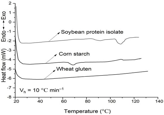 DSC curves of soybean–protein–isolate, corn–starch, and wheat–gluten. The moisture was 50%, and the heating rate was 10 °C min−1.