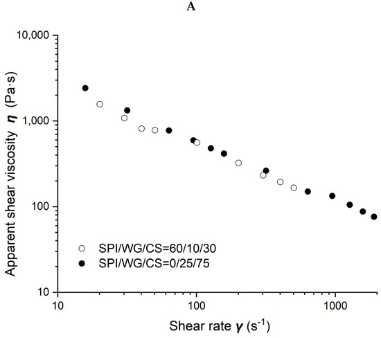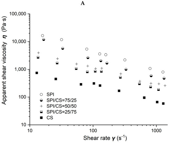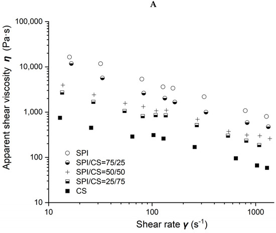 Viscosity as a function of shear rate for different soybean–protein–isolate (SPI)/ corn–starch (CS) blends with 50% moisture content at 80 °C barrel temperature is shown in Figure 2A. Measured viscosity values of all blends were observed to decrease with the shear rate increasing from 10 to 1000 s−1 and with CS content increasing from 0 to 100% in the blends.