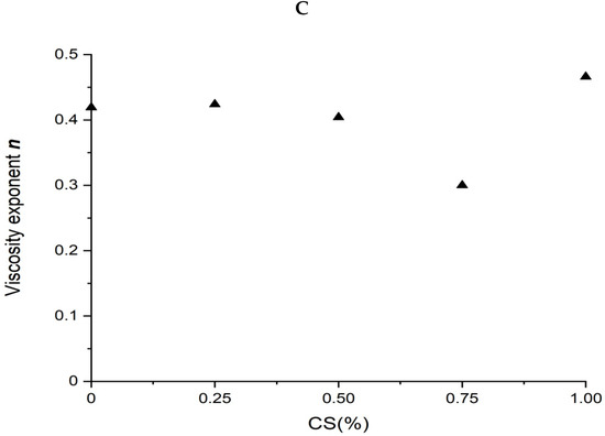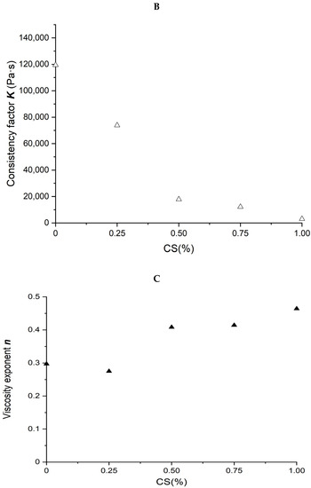 Power law parameters as a function of CS content in the SPI/CS blends are shown in Figure 2B,C. The viscosity exponent n values increased from 0.297 to 0.464, indicating a marked shear-thinning behavior in the blends, and appeared positively correlated with CS content (R2 = 0.843). The consistency factor K values decreased from 119,492 to 3004 Pa·s. The K value of blends decreased with the increase in CS content from 0 to 100% and was negatively correlated with the CS content (R2 = 0.872).