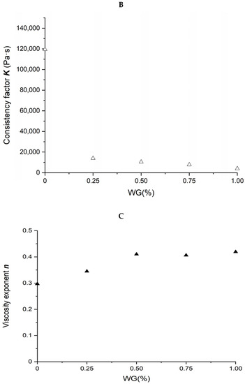 The relation between power law parameters of different SPI/WG blends and WG content is shown in Figure 3B,C. The n value increased from 0.297 to 0.419, not only showing a shear-thinning behavior but also suggesting the formation of some network [9], as WG content increased from 0 to 100% in blends and was positively correlated with the WG content (R2 = 0.837). The consistency factor K decreased from 119,492 to 3,939 Pa·s with WG content increasing from 0 to 100%, and in a negative relationship with WG content (R2 = 0.575).