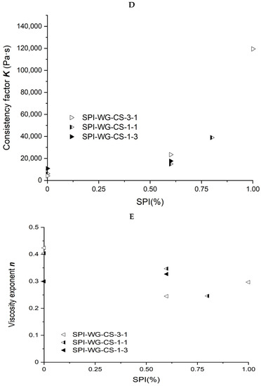 The power law parameters of the different SPI/WG/CS blends are shown in Figure 5D,E. When the ratio of WG/CS was 1, the viscosity exponent n decreased from 0.404 to 0.246, and the consistency factor K increased from 6,087 to 119,492 Pa·s with increasing SPI content. The same trend was observed at 3/1 and 1/3 ratios for the consistency factor K, which increased from 10,837 to 119,492 Pa·s and from 4,101 to 119,492 Pa·s, respectively.