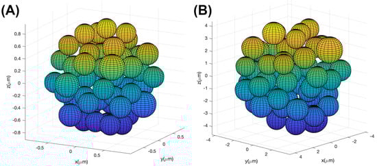 Representative aggregate framework for a (A) 2 m and a (B) 10 m overall cluster diameter. The 2 m diameter aggregate is comprised of constituent spherical particles having a diameter of 0.38 m while the spherical particles that make up the 10 m aggregate are 1.9 m in diameter. These are simply examples of cluster morphology and different frameworks were created that were comprised of different constituent particle sizes.