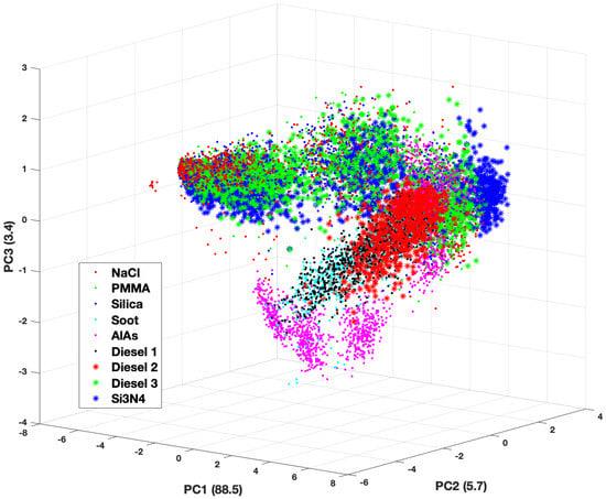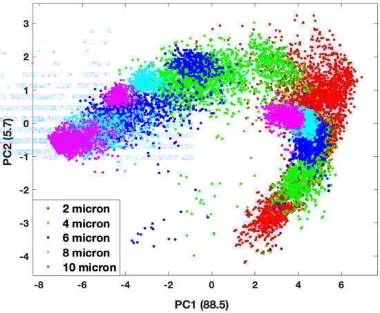 Principal Component Analysis (PCA) was performed on the matrix of descriptors (13,964 × 18) to recast the data in a way that would elucidate information about and provide separation among the classes (e.g., cluster size, material composition). The first two Principal Components (PCs) constitute 94% of the information contained in the forward scattering data set. Figure 4 and Figure 5 show scatter plots of the PC Scores of the forward scattering data set denoting cluster size and material composition, respectively. Grouping is noted but there is significant overlap of groups (either size or material) in these projections.